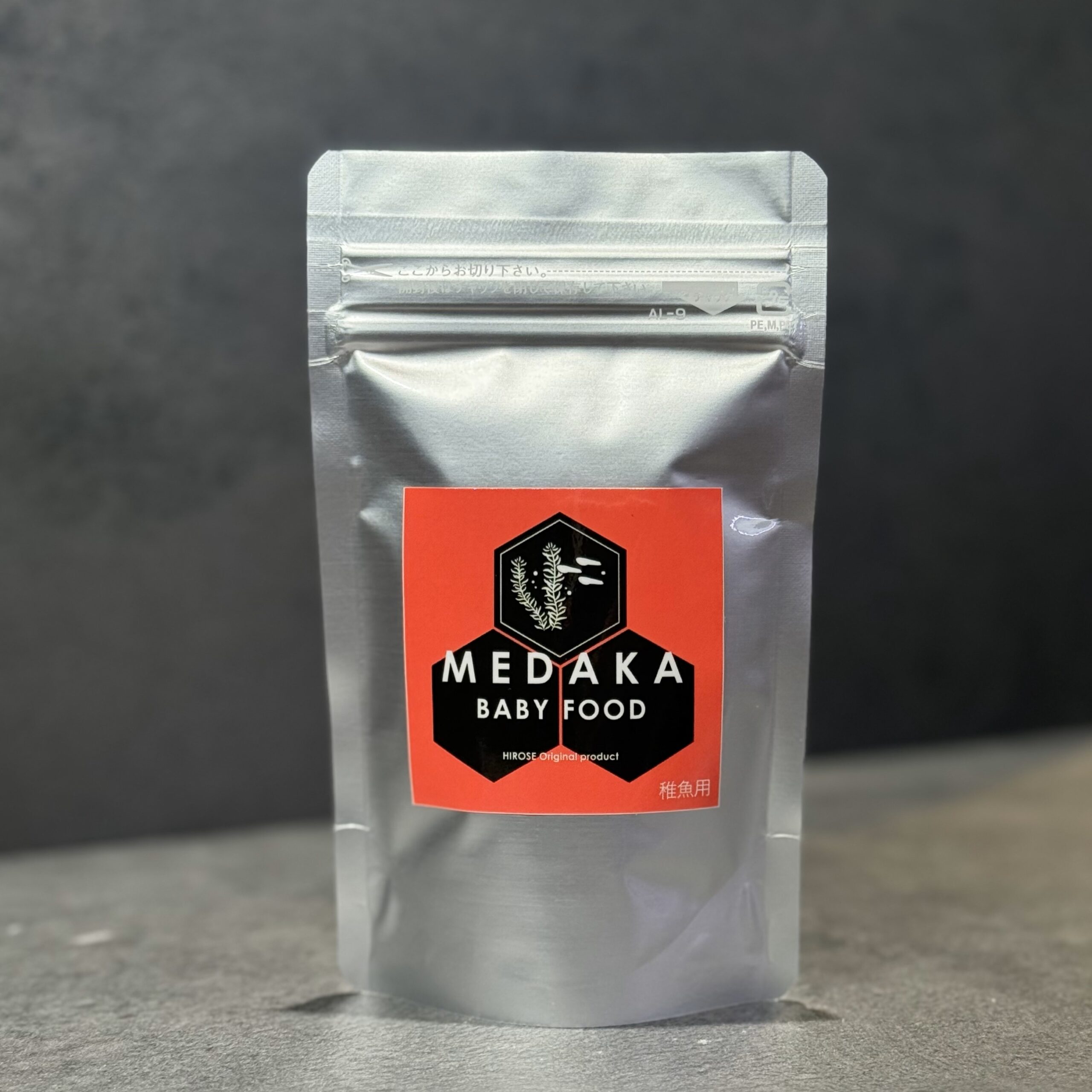 「MEDAKA FOOD 稚魚用」は、孵化直後の極小稚魚に向けた、超微細パウダーフードです。